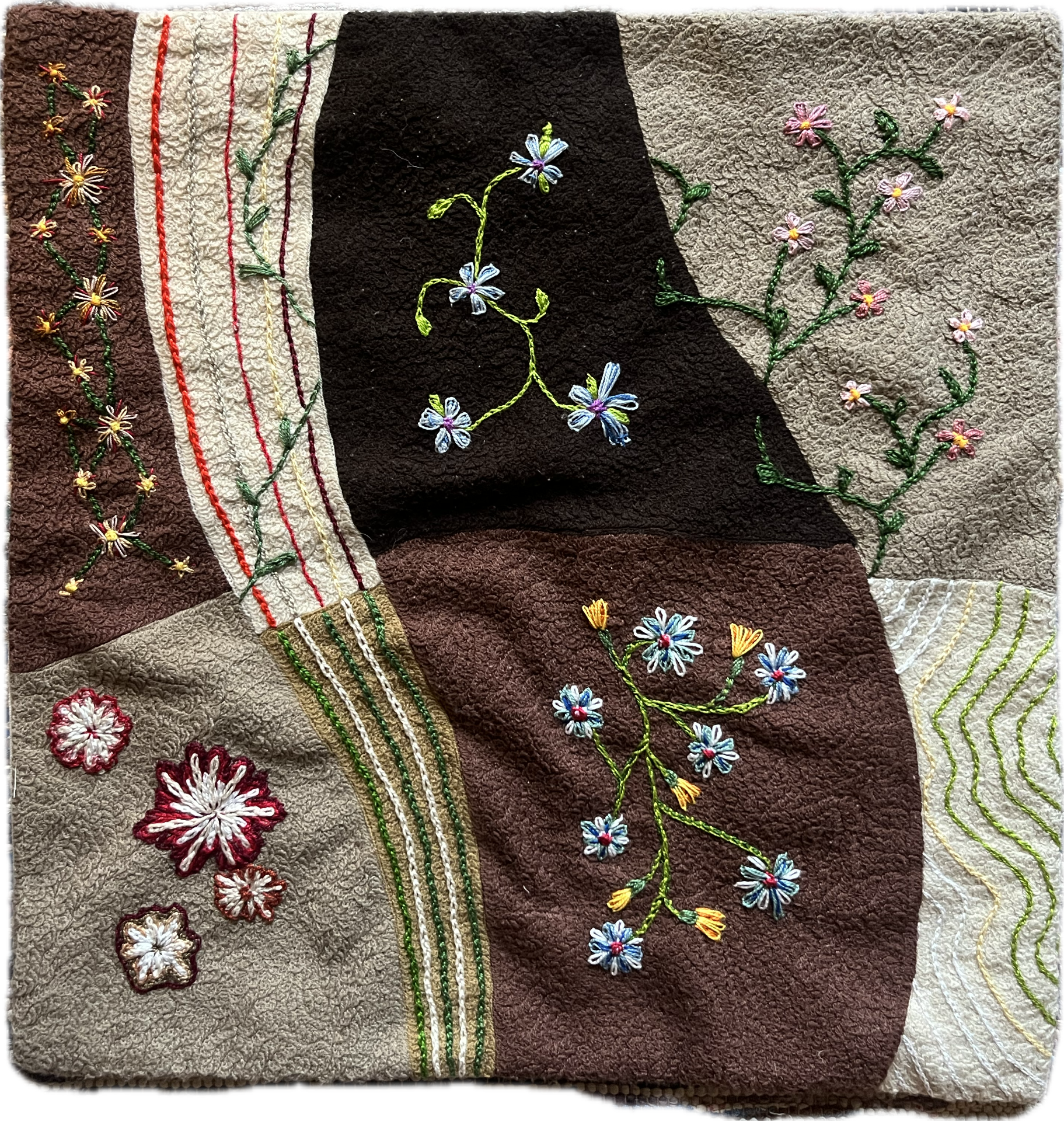 Broderat kuddfodral i olika bruna och beiga färger. I bomull.